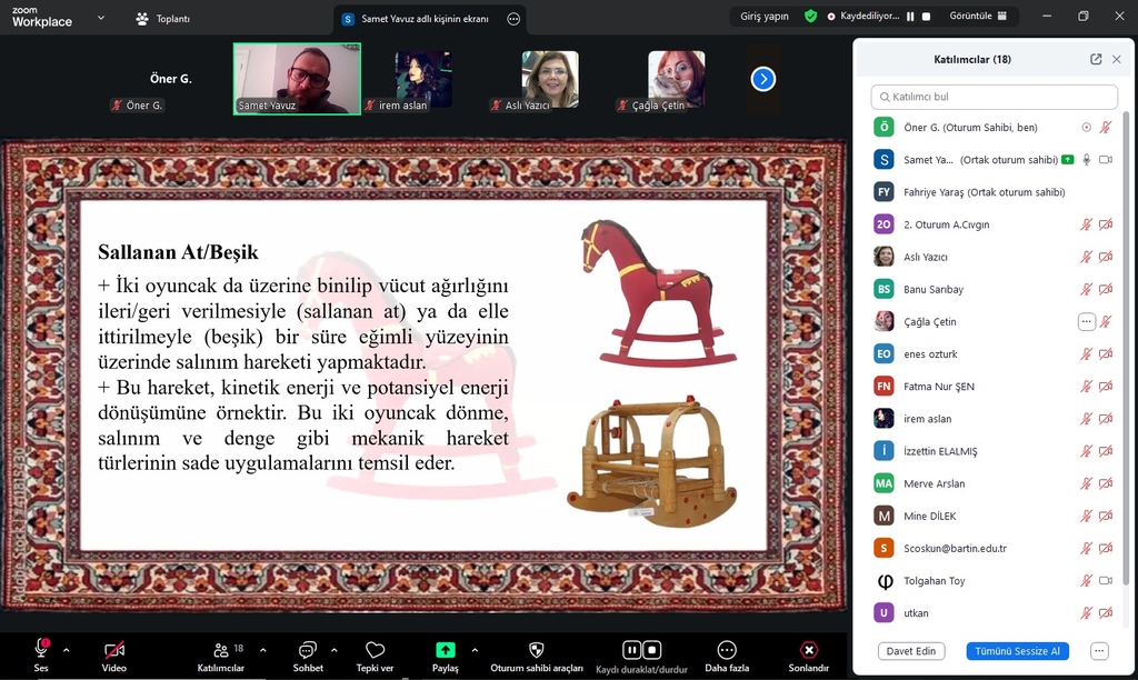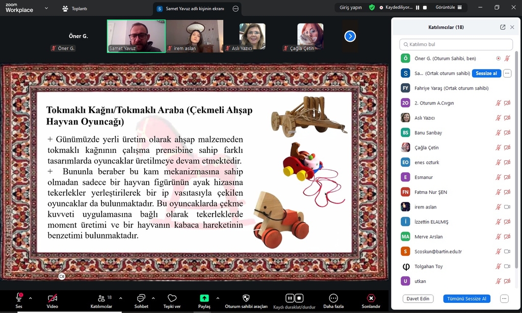 Sunumda, Türk kültüründeki mekanik oyuncaklar Anadolu’nun hareketli oyuncaklarının makine teorisi bakış açısıyla sınıflandırılması üzerinden ele alındı. Ayrıca, Anadolu’da yapılan arkeolojik kazılarda bulunan eski oyuncaklardan örnekler de gösterilerek oyuncakların tarihî ve kültürel önemi vurgulandı. Katılımcılar, sallanan at, beşik, tokmaklı kağnı/araba oyuncağı ve Karagöz-Hacivat figürleri gibi mekanik oyuncakları teknik ve kültürel açıdan değerlendirme fırsatı buldu.
